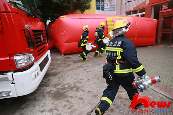 演习中,天马学生公寓16栋三四楼层冒出浓烟,火情发生。阳台上被困学生挥舞毛巾、衣服求救,并拨打火警电话(119),在老师的指挥下,同学们用湿毛巾捂住嘴鼻,有序从安全通道逃生。消防车呼啸而至,麓山门消防中队的消防官兵及时赶到进行救援,帮助被困学生逃离火灾现场,或协助同学跳上安全气垫,或用担架抬出受伤学生,最后将火扑灭。随后,麓山门消防中队李副中队长向同学们介绍学校教学楼、寝室及外出游玩时可能存在的火灾隐患和逃生技巧,并讲解了干粉灭火器和自动呼吸器的使用方法,让学生亲身体验如何灭火。参加演练的一名新生告诉记者,这次演练让他学到了很多知识,发生火灾时,一定要保持冷静,听从消防官兵和老师的指挥,是最重要的。据悉,此次消防演练是军训的一个重要内容,旨在提高同学们的防灾减灾意识,掌握一定的自救技巧。