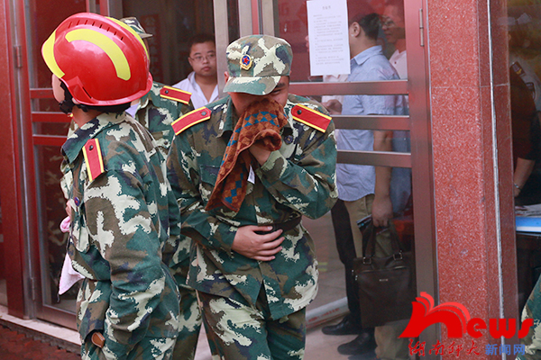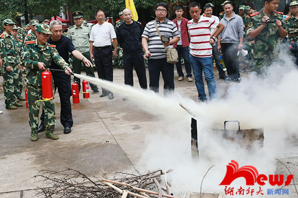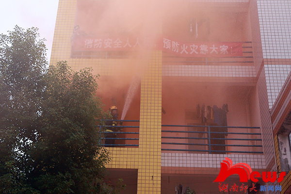 (记者 陈明翠/文 杨俊凯/摄影)9月24日上午,我校学生工作部、保卫处与麓山门消防中队合作,组织2014级新生在天马学生公寓16栋进行消防应急演习。副校长周俊武等观看了演习。